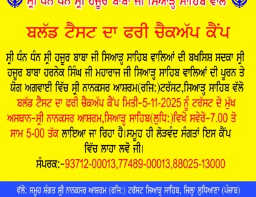 ਸ੍ਰੀ ਧੰਨ ਧੰਨ ਸ੍ਰੀ ਹਜੂਰ ਬਾਬਾ ਜੀ ਸਿਆੜ੍ਹ ਸਾਹਿਬ ਵਾਲੇਬਲੱਡ ਟੈਸਟ ਦਾ ਫਰੀ ਚੈਕਅੱਪ ਕੈਂਪਸ੍ਰੀ ਧੰਨ ਧੰਨ ਸ੍ਰੀ ਹਜੂਰ ਬਾਬਾ ਜੀ ਸਿਆੜ੍ਹ ਸਾਹਿਬ ਵਾਲਿਆਂ ਦੀ ਬਖਸਿਸ਼ ਸਦਕਾ ਸ੍ਰੀ ਹਜੂਰ ਬਾਬਾ ਹਰਨੇਕ ਸਿੰਘ ਜੀ ਮਹਾਰਾਜ ਜੀ…