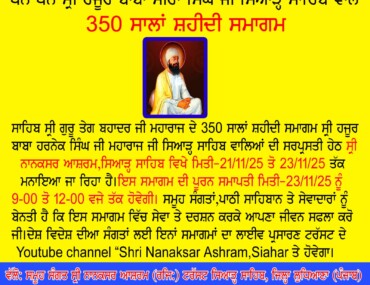 The 350th Martyrdom Celebration of Sahib Sri Guru Tegh Bahadur Ji Maharaj is being observed under the patronage of Sri Hazur Baba Harnek Singh Ji Maharaj Ji Siahar Sahib Wale at Sri Nanaksar Ashram, Siahar…