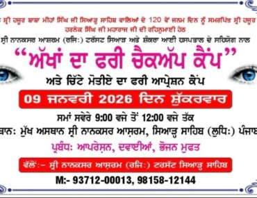 Dedicated to the 120th birthday of Shri Hajoor Baba Mihan Singh Ji Siahar Sahib, under the guidance of Shri Hajoor Baba Harnek Singh Ji, a free eye checkup camp and free cataract surgery camp was organized at Shri Nanaksar Ashram (Regd.) Trust Siahar Sahib on 9th January 2026 in collaboration with Shri Nanaksar Ashram (Regd.) Trust Siahar Sahib and Shankara Eye Hospital. In which special arrangements were made for medicines, surgery and food.