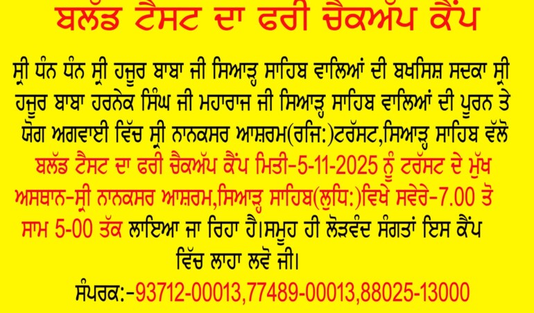 ਸ੍ਰੀ ਧੰਨ ਧੰਨ ਸ੍ਰੀ ਹਜੂਰ ਬਾਬਾ ਜੀ ਸਿਆੜ੍ਹ ਸਾਹਿਬ ਵਾਲੇਬਲੱਡ ਟੈਸਟ ਦਾ ਫਰੀ ਚੈਕਅੱਪ ਕੈਂਪਸ੍ਰੀ ਧੰਨ ਧੰਨ ਸ੍ਰੀ ਹਜੂਰ ਬਾਬਾ ਜੀ ਸਿਆੜ੍ਹ ਸਾਹਿਬ ਵਾਲਿਆਂ ਦੀ ਬਖਸਿਸ਼ ਸਦਕਾ ਸ੍ਰੀ ਹਜੂਰ ਬਾਬਾ ਹਰਨੇਕ ਸਿੰਘ ਜੀ ਮਹਾਰਾਜ ਜੀ…