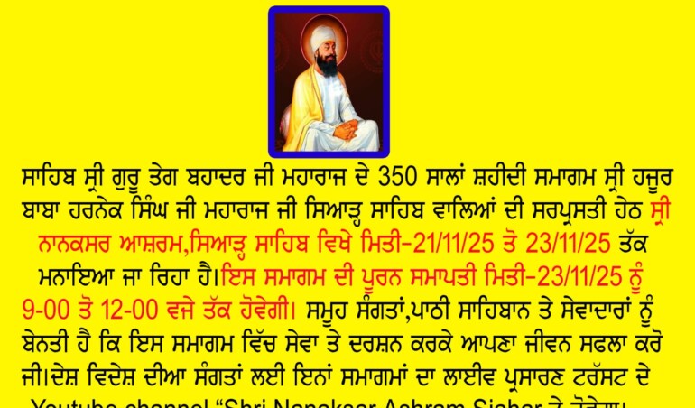 ਧੰਨ ਧੰਨ ਸ੍ਰੀ ਹਜੂਰ ਬਾਬਾ ਜੀ ਸਿਆੜ੍ਹ ਵਾਲਿਆ ਦੀ ਪਵਿੱਤਰ ਯਾਦ ਵਿੱਚ ਜਲ ਪ੍ਰਵਾਹ ਦਿਵਸ ਮਿਤੀ:-7 ਸਤੰਬਰ 2025 ਸਥਾਨ -ਸ੍ਰੀ ਨਾਨਕਸਰ ਆਸ਼ਰਮ,ਬਿਭੌਰ ਸਾਹਿਬ,ਨੰਗਲ ਧੰਨ ਧੰਨ ਸ੍ਰੀ ਹਜੂਰ ਬਾਬਾ ਜੀ ਸਿਆੜ੍ਹ ਵਾਲਿਆ ਦੇ ਮਹਾਨ ਪਰਉਪਕਾਰਾ ਦੀ…