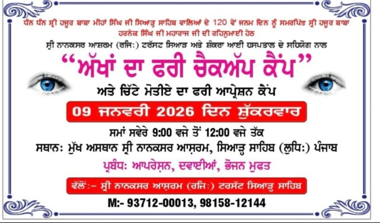 Dedicated to the 120th birthday of Shri Hajoor Baba Mihan Singh Ji Siahar Sahib, under the guidance of Shri Hajoor Baba Harnek Singh Ji, a free eye checkup camp and free cataract surgery camp was organized at Shri Nanaksar Ashram (Regd.) Trust Siahar Sahib on 9th January 2026 in collaboration with Shri Nanaksar Ashram (Regd.) Trust Siahar Sahib and Shankara Eye Hospital. In which special arrangements were made for medicines, surgery and food.