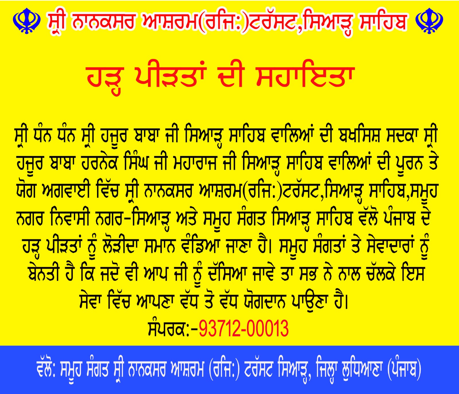 Flood Victims Assistance With the blessings of Shri Dhan Dhan Shri Hazoor Baba Ji Siahar Sahib Wale, under the complete and able leadership of Shri Hazoor Baba Harnek Singh Ji Maharaj Ji Siahar Sahib Wale, Shri Nanaksar Ashram (Regd.) Trust, Siahar Sahib, all the residents of Nagar-Siahar and all the Sangat Siahar Sahib are distributing necessary goods to the flood victims of Punjab. All the Sangats and Sevadars are requested that whenever you are informed, everyone should come along and contribute their maximum in this service.