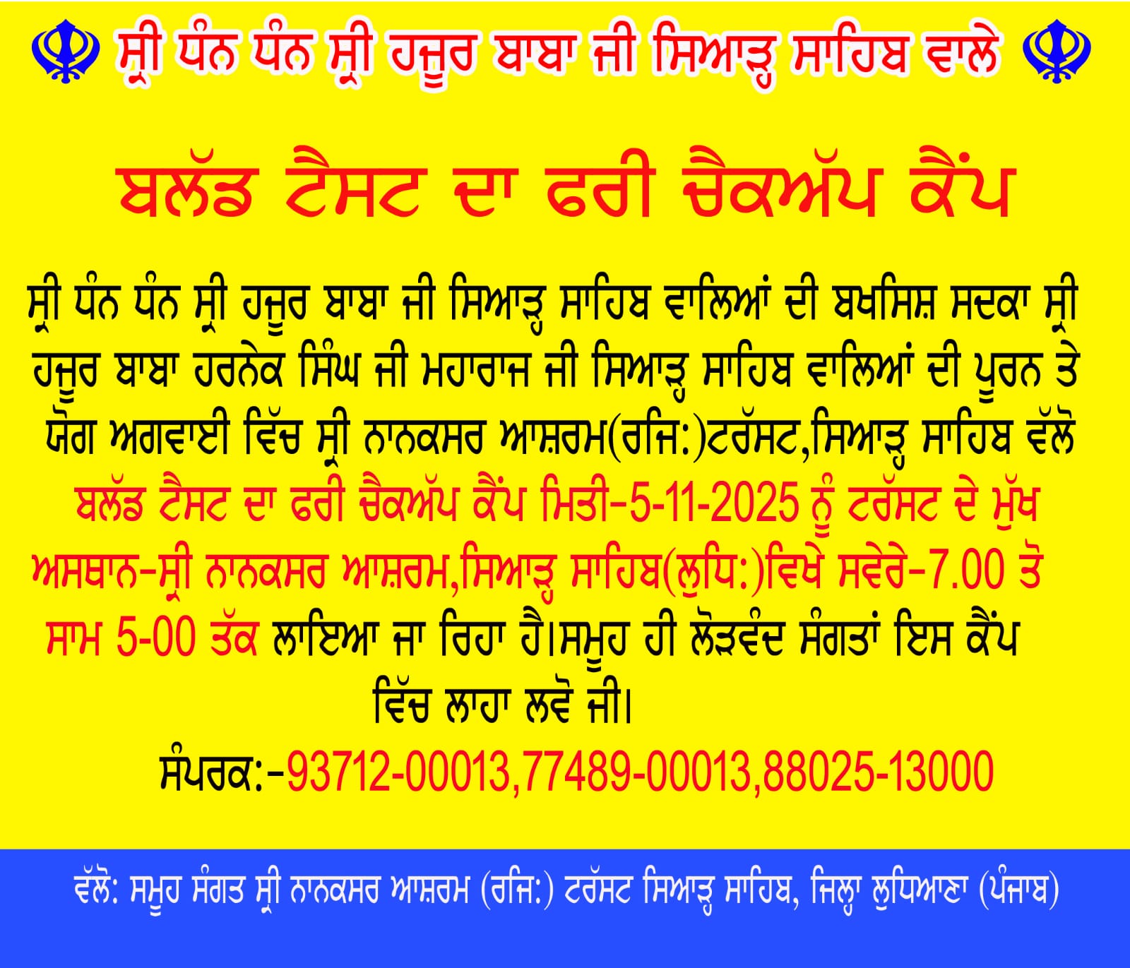 Free Blood Test Checkup Camp with the blessings of Sri Dhan Dhan Sri Hazur Baba Ji Siahar Sahib Wale, under the complete and able leadership of Sri Hazur Baba Harnek Singh Ji Maharaj Ji Siahar Sahib Wale, Sri Nanaksar Ashram (Regd.) Trust, Siahar Sahib, a free blood test checkup camp is being organized on 5-11-2025 at the head office of the trust – Sri Nanaksar Ashram, Siahar Sahib (Ludhiana) from 7.00 am to 5.00 pm. All the needy devotees are welcome to take advantage of this camp.Mob 93712-00013,77489-00013,88025-13000