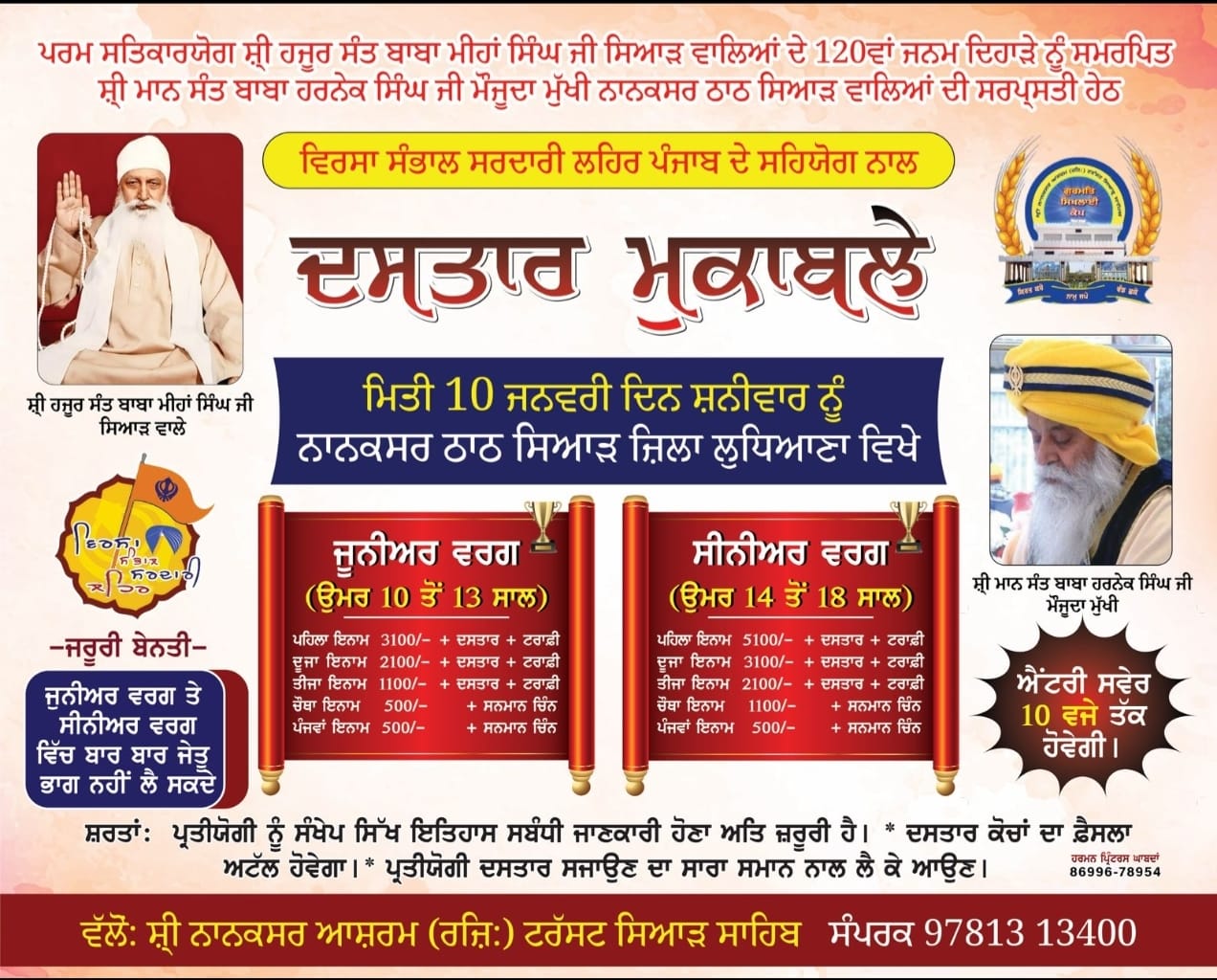 ਸ੍ਰੀ ਹਜ਼ੂਰ ਬਾਬਾ ਹਰਨੇਕ ਸਿੰਘ ਜੀ ਮਹਾਰਾਜ ਜੀ ਸਿਆੜ੍ਹ ਸਾਹਿਬ ਵਾਲਿਆਂ ਦੀ ਪੂਰਨ ਤੇ ਯੋਗ ਅਗਵਾਈ ਵਿੱਚ ਧੰਨ ਧੰਨ ਸ੍ਰੀ ਹਜ਼ੂਰ ਬਾਬਾ ਜੀ ਸਿਆੜ੍ਹ ਸਾਹਿਬ ਵਾਲਿਆਂ ਦੇ ਮਨਾਏ ਜਾ ਰਹੇ ਜਨਮ ਦਿਵਸ 13-1-2026 ਨੂੰ ਸਮਰਪਿਤ ਸ੍ਰੀ ਨਾਨਕਸਰ ਆਸ਼ਰਮ (ਰਜਿ:)ਟਰੱਸਟ,ਸਿਆੜ੍ਹ ਸਾਹਿਬ, ਜਿਲ੍ਹਾ – ਲੁਧਿਆਣਾ,ਪੰਜਾਬ ਵਿਖੇ ਅੱਜ ਮਿਤੀ -10-1-26 ਨੂੰ ਬਾਬਾ ਜੀ ਦੇ ਤੱਪ ਅਸਥਾਨ ਸ਼੍ਰੀ ਨਾਨਕਸਰ ਆਸ਼ਰਮ, ਸਿਆੜ੍ਹ ਸਾਹਿਬ ਵਿਖੇ ਹੋਏ ਦਸਤਾਰ ਮੁਕਾਬਲੇ ਦੇ ਸਜਾਏ ਗਏ ਜਿਸ ਵਿੱਚ ਵੱਖ ਵੱਖ ਉਮਰ ਦੇ ਬੱਚਿਆਂ ਨੇ ਵੱਧ ਚੜ ਕੇ ਹਿੱਸਾ ਲਿਆ ਅਤੇ ਜੇਤੂਆਂ ਨੂੰ ਵੱਖ ਵੱਖ ਇਨਾਮ ਵੀ ਦਿੱਤੇ ਗਏ |